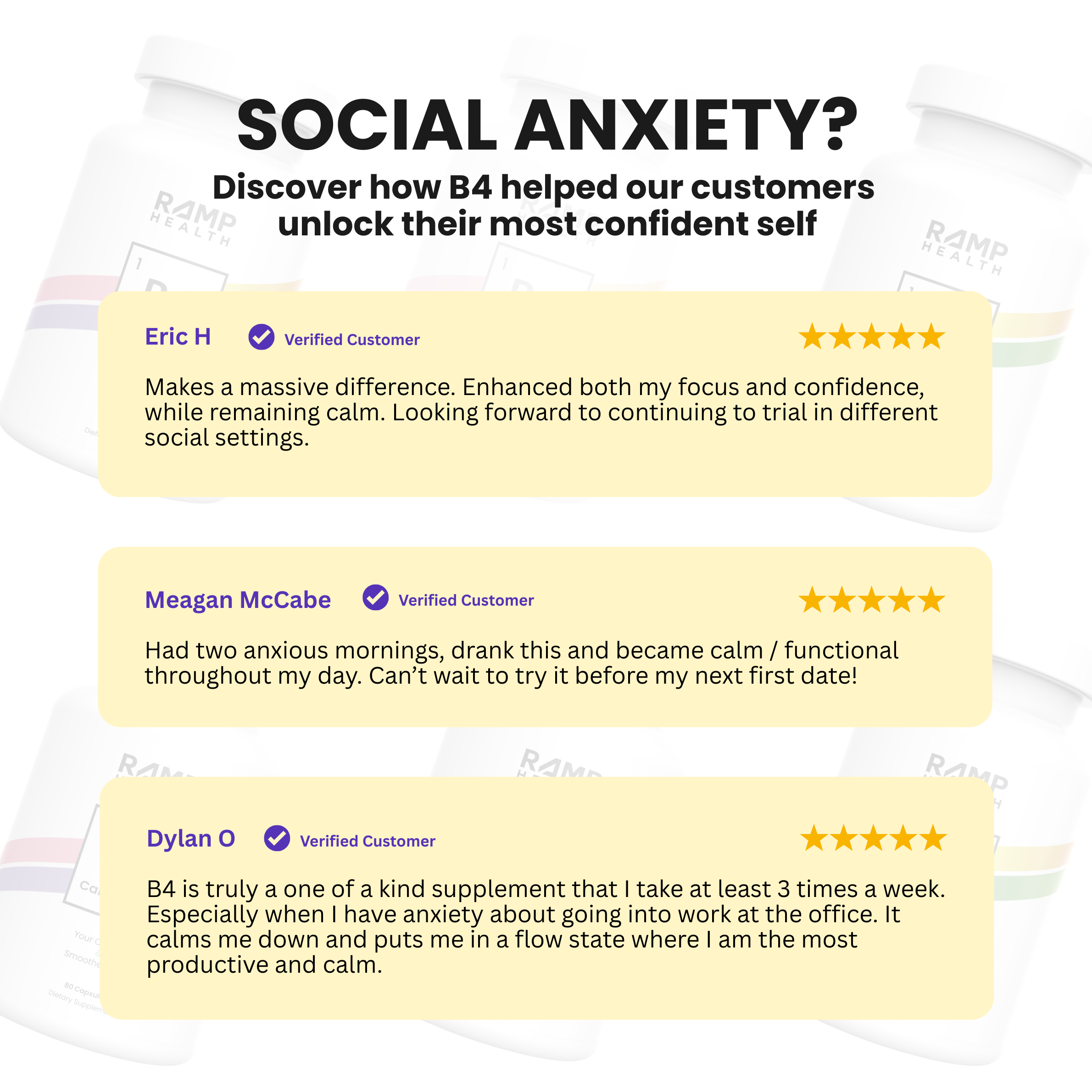 “B4 helps lower my anxiety/catastrophizing and bring out my engaging/funny/confident side. When I take B4 it essentially eliminates my negative thoughts, tendency to spiral, scarcity mindset, etc. It's like my "natural self" that I had when I was a kid is able to come out. It definitely helps me to really see what's actually real and what's just in my head.”